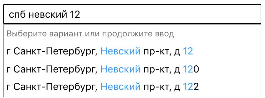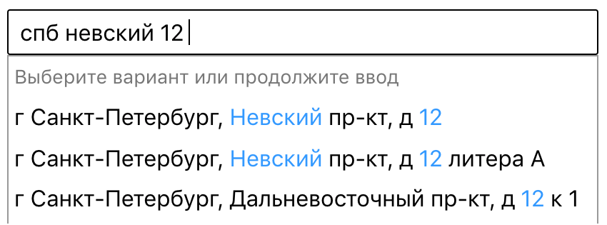 Чтобы помирить реальность с представлением ФИАС, «Подсказки» возвращают оба варианта домов — и без литер, и с литерами. Выбирайте тот дом, который вам больше нравится: